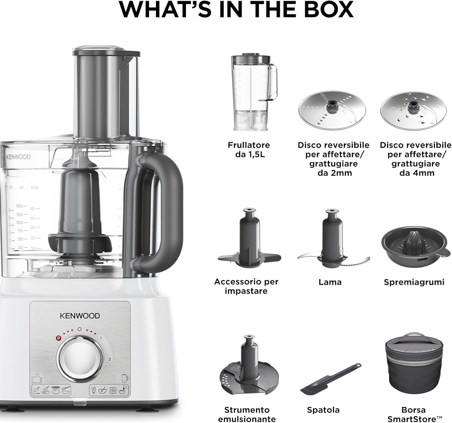 - 10 accessoires inclus: blender 1,5L, 4 disques à râper/émincer en acier inoxydable, presse-agrumes, couteau, pétrin, émulsionneur et spatule